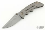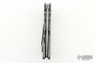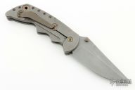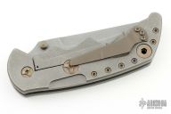 This Tank from Steven Kelly features a tumble finished clip point blade with swedge and dual anodized titanium thumbstuds. The handle is comprised of machined and tumbled titanium frame with bronze anodized hardware and barrel spacers. Matching tip up clip. Includes padded and zippered case. Has a scuff on the clip, otherwise excellent condition.