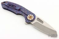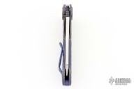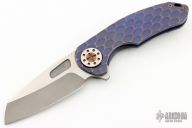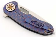 This F3 Medium by Curtiss Knives features a two-tone blade with notched thumbrest and flipper. The handle has an SPM Milled and bead blast and anodize finished titanium frame over notched titanium backspacer, titanium tip up clip. Smooth and fast opening using a Caged Bearing System. Nice blade seating, detent and lock up.  Includes the original box, zippered case and COA dated 1-14-23. Excellent condition.