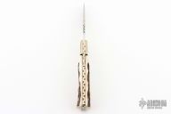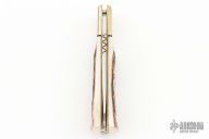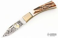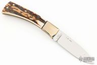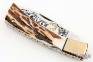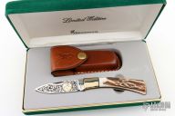 This knife by Browning is 1 of 1000 and is #0089, it features a mirror polished blade with fileworked thumbrest and a nail nick. The handle has nickel silver bolsters, stag scales with black liners/spacers, brass liners and a stainless steel backspacer. Comes with original box, sheath and papers. Excellent condition.