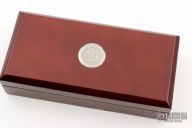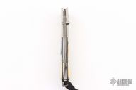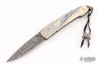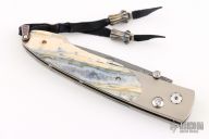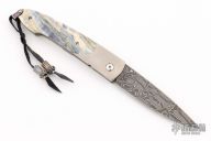 This B10 AGR (A.G. Russell) Exclusive button lock folder has a Mike Norris "Ribbon Lace" Damascus spear point blade with single thumb stud. Both thumb stud and lock button have white topaz insets. Frame is aerospace grade titanium under fossil mammoth tooth scales, titanium barrel type spacers, and lanyard with sterling silver bail and beads. Excellent condition. Comes with black ostrich slip sheath, original wood display case, original box, and Certificate of Authenticity.