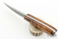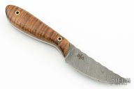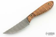 This Skinner by Bill Akers of Backwoods Custom Knives features a Damascus blade with fileworked spine, .118" blade stock and .962" blade depth, full tang construction.  The handle has tiger maple scales with mosaic pins. Has a couple light oxidation spots, otherwise good condition.