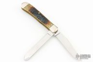 This Trapper by Case features 2 polished blades with nail nicks. The handle has nickel silver bolsters, jigged bone covers, with a Case shield, brass liners and stainless springs. Excellent condition.