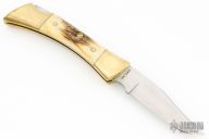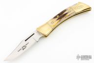 This lockback folder features a satin finished clip point blade with nail nick. The handle has brass bolsters, front and rear, brass liners, and stag scales. Has some light scratches, but otherwise the knife is in excellent condition.