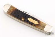 This Trapper by Case features 2 polished blades with nail nicks. The handle has nickel silver bolsters, jigged bone covers, with a Case shield, brass liners and stainless springs. Excellent condition.
