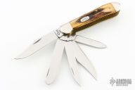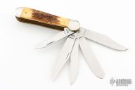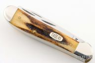 This knife by Case knives features mirror polished blades with nail nicks. The handle has nickel silver bolsters, stag covers, brass liners and stainless steel springs. Excellent condition.