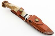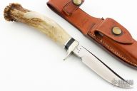 This Model G by Ralph Bone features a satin finished blade with swedge, .177" blade stock and .809" blade depth, hidden tang construction. The handle has a nickel silver guard with a crown stag grip with black and aluminum spacers. #449 on the blade. Comes with brown leather sheath. Excellent condition.