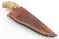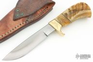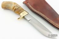 This Camp Knife by Ed Fowler features a nearly mirror polished drop point blade with convex ground bevels, .325" blade stock and 1.236" blade depth, hidden tang construction. The handle has an engraved brass guard, sheep horn grip with sheep horn and black spacers. Comes with a brown leather sheath and a zippered case. Excellent condition.