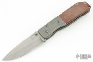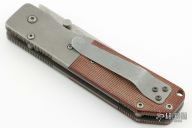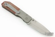 This B880 Buck/Strider folder has been made into a "Po-Boy". It has a bead blasted spear point blade with dual thumbstuds and notched thumbrest. The handle originally had black G-10 scales (not included), it now has dovetailed bead blasted titanium bolsters, brown canvas micarta scales, bead blasted titanium liners, tip up stainless steel clip. Has some scuffs and scratches, otherwise good condition.