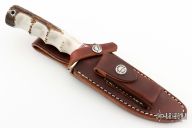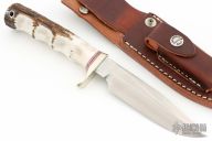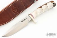 This Model 5-5 by Randall Made Knives features a satin finished blade with false top edge and notched thumbrest, .220" blade stock and 1.099" blade depth, hidden tang construction. The handle has a nickel silver guard, stag grip with finger grooves and red/white/blue spacers. Comes with a brown leather sheath and Randall papers. Excellent condition.