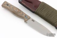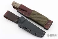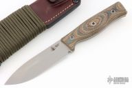 This GSO 4 from Survive Knives features a bead blasted drop point blade, .127" blade stock and 1.093" blade depth, full tang construction. The handle has canvas micarta scales. Includes kydex sheath and a brown leather sheath. Excellent condition. #062