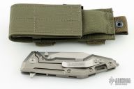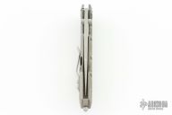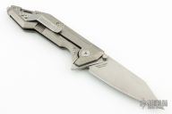 This Centauro by Raid Ops features a tumbled, clip point blade with dual thumbstuds and a flipper. The handle has a tumbled and milled titanium frame, tumbled titanium backspacer, steel glass breaker at the butt and a tip up tumbled stainless steel clip. Comes with original box, sheath and papers. New from maker.