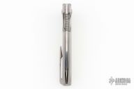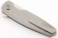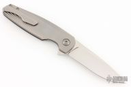This Morpheus by Holt Bladeworks features a near mirror polished stonewash finished blade with a notched thumbrest and flipper tab. The handle features a bent starburst milled titanium frame with nude finish tip up pocket clip and hardware. Nice detent, lock up and blade seating. Includes the original zipper case and papers. Excellent condition.