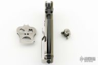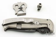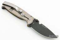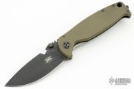 This DPx HEST/F 2.0 features a black PVD coated drop point blade with serrations, dual thumb studs and notch that doubles as a bottle opener. The notched thumb rest pulls pulls double duty with three different sized wire strippers. The handle is comprised of an OD green G10 "A" side and a tumbled titanium lockside with "RotoBlock" mechanism that turns the knife into a virtual fixed blade with a turn of the dial. Black polymer backspacer. The stainless steel tip up clip can be positioned for left or right hand carry. Carbide glass breaker on pommel can be replaced with a rounded screw (included) if desired. Lanyard hole doubles as a 1/4" hex driver. Comes with Skull Tool. Comes with original box and papers, has some light scuffs, otherwise excellent condition.