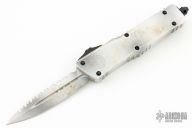 This Combat Troodon OTF automatic features a D/E blade with one fully serrated edge. The handle is composed of a Sandtrooper finished aluminum frame. Stainless steel clip. Glass breaker. 07/2023, S/N 269. Excellent condition. Comes with original box and papers.