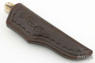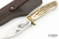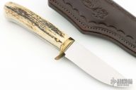 This knife by Jim Sigg (Siggma) features a mirror polished blade with engraving on one side dated 1994, .121" blade stock and .974" blade depth, full tang construction. The handle has brass guard and stag scales with brass pins. Comes with a hand tooled brown leather sheath. #092694. Has some light scratches, has been sharpened, otherwise good condition.