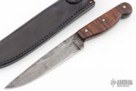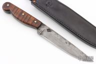 This French Style Trade Knife by Riverborn Knives features a hand forged blade with antiqued finish, .151" blade stock and 1.067" blade depth, full tang construction. The handle has tiger striped maple scales with hand peened copper pins. Comes with a brown leather sheath. Excellent condition.