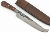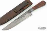 This 18th Century Rifleman or Butcher Style Knife by Riverborn Knives features a hand forged blade with antiqued finish, .165" blade stock and 1.449" blade depth, full tang construction. The handle has pewter bolsters, tiger striped maple scales with hand peened copper pins. Comes with a brown leather sheath. Excellent condition.