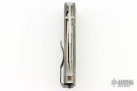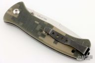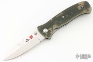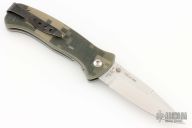 This mini SERE linerlock folder has a satin finished VG-10 stainless steel drop/ spear point blade with dual thumb studs. The handle is digicam G10 over stainless steel liners, black stainless steel tip up clip, and lanyard hole. Has a couple of light scratches otherwise the knife is in excellent condition.