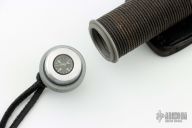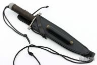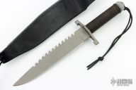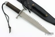 This knife has a 9" blade with 12 saw teeth (8 double split teeth and 4 single), .243" blade thickness and 1.450" blade depth. The stainless steel handle is waterproof, cord wrapped, and hollow. The aluminum butt cap unscrews to reveal a compass, and allows you to use the hollow handle for storage. Comes with a black leather sheath with sharpening steel made by "Johnson Sheathery". Excellent condition.