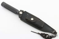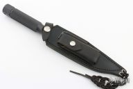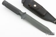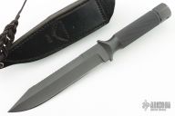 This Mk. IV by Chris Reeve Knives was made in South Africa. It has a clip point blade with a nearly sharpened top edge and saw teeth along the spine, .218" blade stock and 1.251" blade depth, integral construction with knurled handle and removable aluminum butt cap. Comes with a black leather sheath with belt loop, it is not original, but fits nicely. Has a couple light scuffs, otherwise excellent condition.