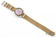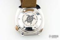 This Custom Seiko watch was made with Seiko parts. Has a stainless steel case, purple dial, gold/black bezel, canvas strap. Diver's 200m. Automatic. Has some light scratches, otherwise excellent condition.
