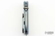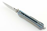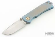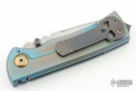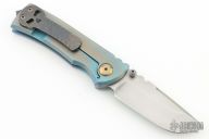 This Chaves American Made Knives Redencion 228 is frame lock folder based on the popular Redencion custom knife made by Ramon Chaves. It has been modified by Serpents Run Customs. It features a hand rub satin finished blade with dual thumbstuds and notched thumbrest. The handle has "Shipwreck" finished titanium scales, "Rock Chipped" blacken titanium clip and backspacer with skull crusher. Nice detent, lockup and blade seating. Has a few light scuffs, otherwise excellent condition. Comes with original hard case and a COA from Serpents Run Customs.