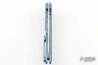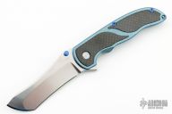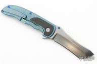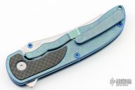 This Norseman Flipper from John Grimsmo features a stonewash finished blade with a single thumbstud, notched thumbrest and a flipper. The handle has a green with blue flakes finished titanium frame with carbon fiber inlays, tip up titanium clip with hidden screws. Smooth action that requires no wrist movement. Nice detent, lockup and blade seating. Comes with original box, tool, lube and COA dated Dec 22, 2023. Excellent condition.