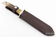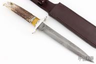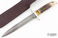 This Dagger knife by Jesse Davis features a double edged Damascus blade, .176" blade stock and 1.065" blade depth, hidden tang construction. The handle has a nickel silver guard, carved stag grip with an eagle's head, amber and fileworked nickel silver spacers. Comes with a brown leather sheath and a zippered case. Excellent condition.