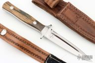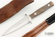 This custom Dagger by Weldon Whitley features a mirror polished double edged blade with .167" blade stock and .985" blade depth, full tang construction. The handle has a stainless steel guard, mammoth ivory scales with white liners/spacers. Includes a hand tooled brown leather sheath. Has a couple light scratches, otherwise excellent condition. #0131