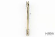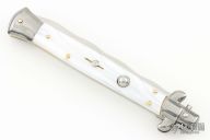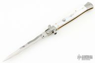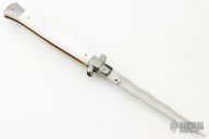 This Swivel Bolster by Frank Beltrame features a polished Kris ground blade with false top edge. The handle has stainless steel bolsters, front and rear, pearlex scales, brass liners, stainless spring. Excellent condition.