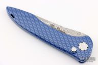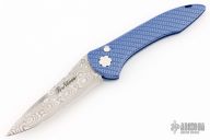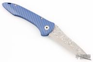 This side opening auto by TiNives features a spear point Damascus blade with false top edge. The handle is textured aluminum with stainless steel push button. Comes with original box. Excellent condition.