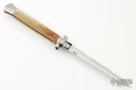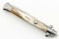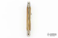 This Swivel Bolster by Frank Beltrame features a polished Kris ground blade with false top edge. The handle has stainless steel bolsters, front and rear, honey horn scales, brass liners, stainless spring. Excellent condition.