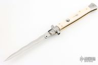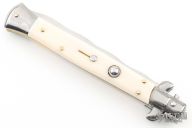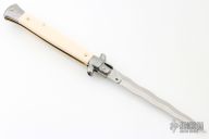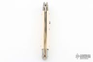 This Swivel Bolster by Frank Beltrame features a polished Kris ground blade with false top edge. The handle has stainless steel bolsters, front and rear, imitation ivory scales, brass liners, stainless spring. Excellent condition.