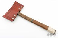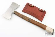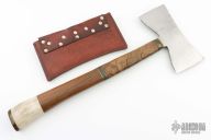 This Double Bit Camp Axe by the Late John Nelson Cooper features a satin finished head that is 7.125" from blade to blade and 3.25" blade lengths, hidden tang construction. The handle has a brass guard and butt, brass and black linen micarta spacers, wood grip with elk antler near the butt. Comes with a hand tooled brown leather sheath. Has some scratches and some oxidation/staining on the blade, has some natually occuring cracks in the handle, otherwise good condition. One of a kind?