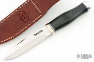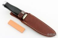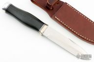 This Gambler by Randall Made Knives features a satin finished blade with .214" blade stock and 1.036" blade depth, hidden tang construction. Sharpened top edge. Notched thumbrest. Black linen micarta grip with nickel silver guard, black/duralumin spacers, duralumin butt. The Gambler is one of Randall's non-catalog knives. Comes with a brown leather sheath and original paper wrapping. Excellent condition.