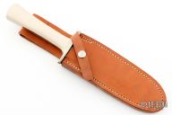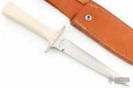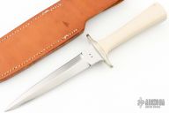 This Dagger from Enedino De Leon features a satin finished double edge blade with .195" blade stock and 1.040" blade depth, full tang construction. The handle is comprised of a nickel silver guard and ivory paper micarta scales with aluminum pins and black liners. Includes a brown leather sheath with belt loop. Excellent condition.