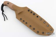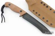 This Behring Technical Bushido features a black recurve tanto blade with false top edge, .247" blade stock and 1.533" blade depth. The handle is comprised of milled and contoured coyote brown G-10 scales over full tang construction. Lanyard hole with lanyard in pommel. Includes kydex sheath with belt clip. Marked #077 on ricasso and dated 12-16. Excellent condition.