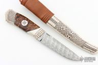 This Knife by P-O Eklund features a Rickard Perman Damascus blade with false top edge, .235" blade stock and 1.175" blade depth, hidden tang construction. The handle is made from reindeer antler, has traditional horn engraving done by P-O Eklund, burlwood grip. Comes with a matching reindeer antler and brown leather sheath. New from maker. Comes with COA