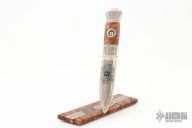 This Knife by P-O Eklund features a Mattias Styrefors Mosaic Damascus blade, .148" blade stock and 1.161" blade depth, hidden tang construction. The handle is made from reindeer antler, Mattias Styrefors Damascus inlay, and stabilized burl wood center, has traditional horn engraving done by P-O Eklund. Comes with a burl wood and reindeer antler stand with matching scrimshaw and a couple mosaic Damascus inlays. New from maker. Comes with COA