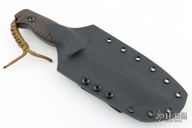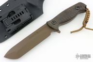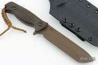 This Behring Technical Valkyrie features a brow coated, drop point blade with swedge. 0.25" blade stock and 1.361" blade depth. The handle is comprised of sculpted and contoured micarta scales over full tang construction. Lanyard hole with lanyard in pommel. Includes kydex sheath with Tek-Lok. Numbered #079 on ricasso and dated 02-16. Excellent condition.