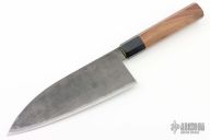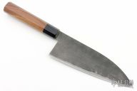 The Funayuki is traditionally used for cutting vegetables, fish or meat. The blade is Stainless Clad Aogami Super Steel (NAS). As with all of Takeda's knives, it has a strong sharp edge. The octagon shaped wood handle is easy to hold. 180mm cutting edge, .110" blade stock and 2.318" blade depth. Comes with original box and papers. Brand new from maker.
