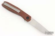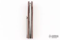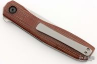 This drop point Flipper by Jason Clark features a hand rub satin finished blade with a notched flipper. The handle has canvas micarta scales over titanium liners with a titanium tip pocket clip and a stainless steel backspacer.  Nice detent, lockup and blade seating. Comes with a leather slip sheath and COA. Has some spots on the blade. Great condition otherwise.