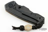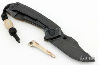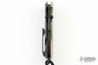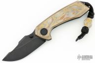 This War Cry framelock folder by 4Ever Knives features a blackwashed blade with dual thumbstuds. The handle is comprised of a blackwashed titanium frame and Vegas Forge Random Mokume pattern scale with a lanyard hole at the butt with attached bead. Matching titanium clip positioned for tip up carry. Nice detent, blade seating and lockup. Comes with original box, extra mokume clip, and COA. Has some scuffs, otherwise excellent condition.