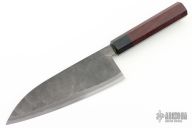 The Debabocho is a heavy knife traditionally used for filleting fish. The blade is Stainless Clad Aogami Super Steel (NAS) which is a high-carbon steel alloy with vanadium and is ground on both sides. As with all of Takeda's knives, it has a strong sharp edge. The octagon shaped wood handle is easy to hold. 195 mm cutting edge, .275" blade stock and 2.381" blade depth. Brand new from maker. Comes with original box.
