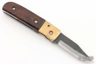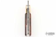 This Inagaki Linerlock Folder features a Stainless clad Aogami Super Steel (NAS) blade which is a high-carbon steel alloy with vanadium and is ground on both sides. The handle has textured brass bolsters, desert ironwood burl scales with polished stainless steel liners. New from maker. Comes with original box.