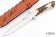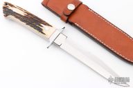 This Fighter by SR Johnson features a mirror polished double edged clip point blade, .210" blade stock and 1.054" blade depth, full tapered tang construction. The handle has a stainless guard, stag scales with stainless pins, thong hole and red liners. Comes with brown leather sheath and zippered case. Has some light finishing scratches, Excellent condition.