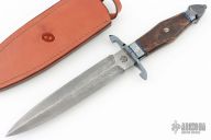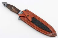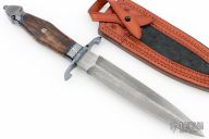 This Dagger by Journeyman Smith Kelly Vermeer Vella features a double edged Damascus blade with .210" blade stock and 1.255" blade depth, hidden tang construction. The handle has a blued steel guard, engraved Damascus collar and butt, anodized spacers, desert ironwood grip, blued steel tang nut. Comes with a Paul Long hand tooled brown/black leather sheath. Comes with zippered case. Excellent condition.