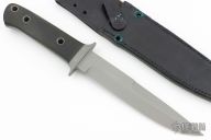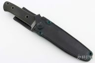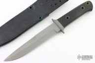 This fighter is a very special and rare knife made by Al Mar and William Harsey, it features a bead blasted blade with sharpened top edge, .245" blade stock and 1.253" blade depth, full tapered tang construction. The handle has a bead blasted stainless steel guard and black linen micarta scales. Comes with a black leather sheath. Has some light scuffs, otherwise excellent condition. The makers marks are hand engraved.