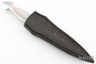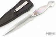 This dagger by Billy Mace Imel features a double edged hand rub satin finished blade, .333" blade stock and .733" blade depth, full integral with tapered tang. Has black lip pearl inlays. Excellent grinds and finish work. Great feel in the hand. Comes with black leather sheath and zippered case. Has a couple light scuffs, otherwise excellent condition.