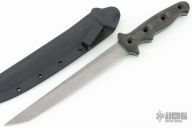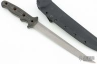 This Vorpal 1-C by Ben Tendick features a bead blast and tumble finished tanto blade with notched thumb and finger rests, full tang construction, .214" Blade Stock, 1.038" Blade Depth. The handle has black linen micarta scales. Includes a kydex sheath. Excellent condition.